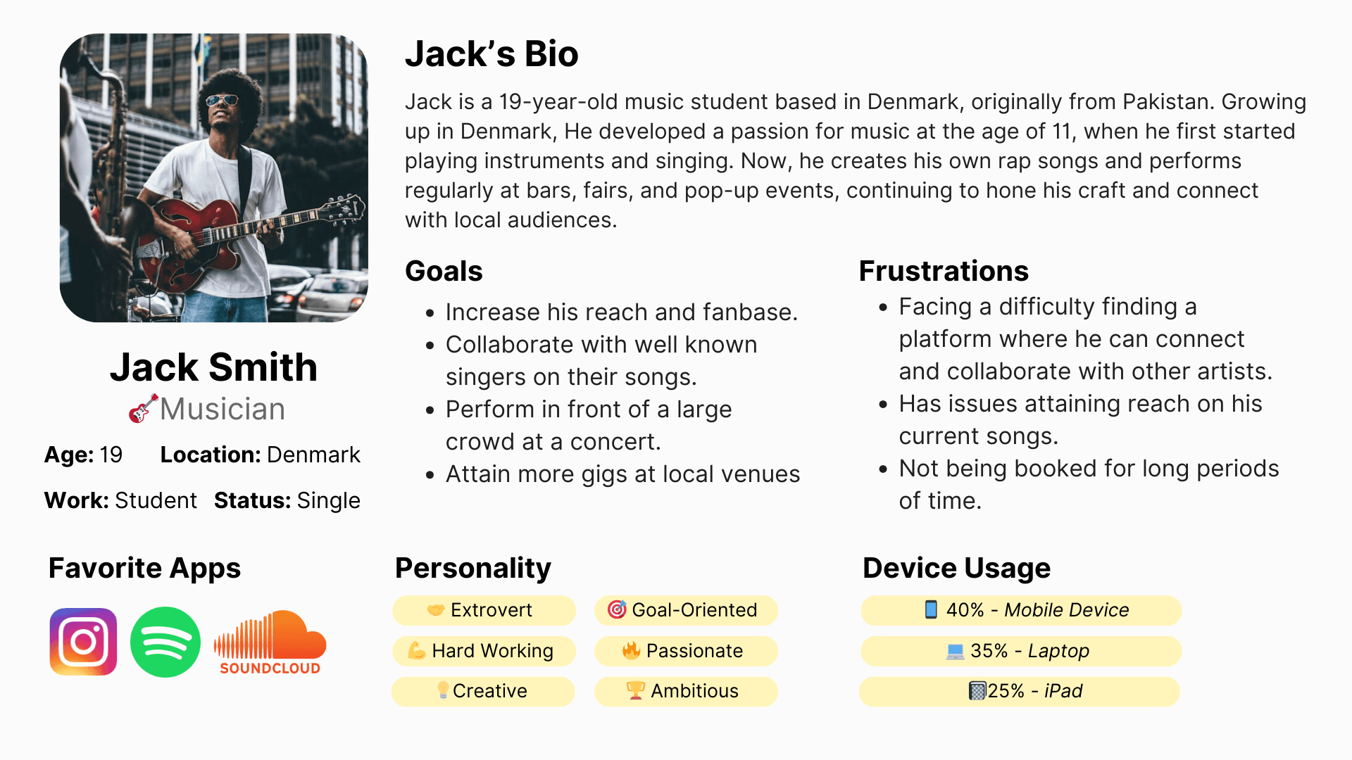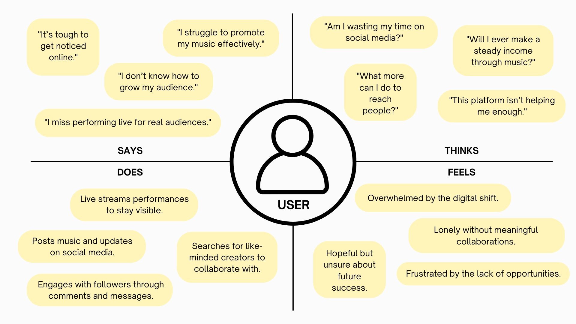Using user personas, empathy maps, and journey maps, I gained valuable insights into the user experience. This understanding enabled me to create a technology-driven solution that connects artists with new opportunities in the digital landscape.