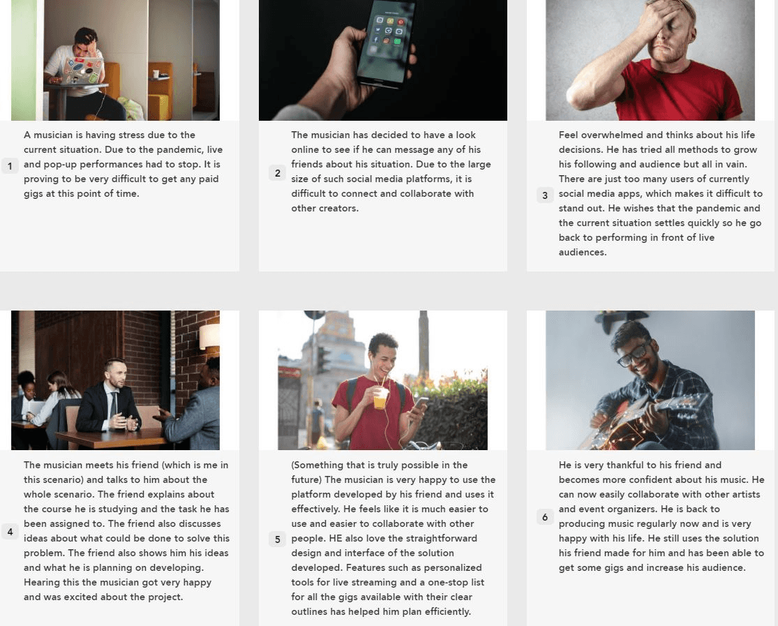 To bring my solution to life, I created a storyboard that illustrates a hypothetical scenario involving a friend who is a creator interacting with the app I designed. The sequence follows his journey: initially, he is concerned about his career prospects due to COVID-19 and the loss of live performance opportunities. Then, he meets with me, where I introduce the app as a solution for connecting creators with virtual gigs. This conversation leaves him feeling hopeful about new possibilities. A few months later, he begins using the app, successfully finding paid gigs and growing his audience, ultimately expressing gratitude for the platform’s positive impact on his career.