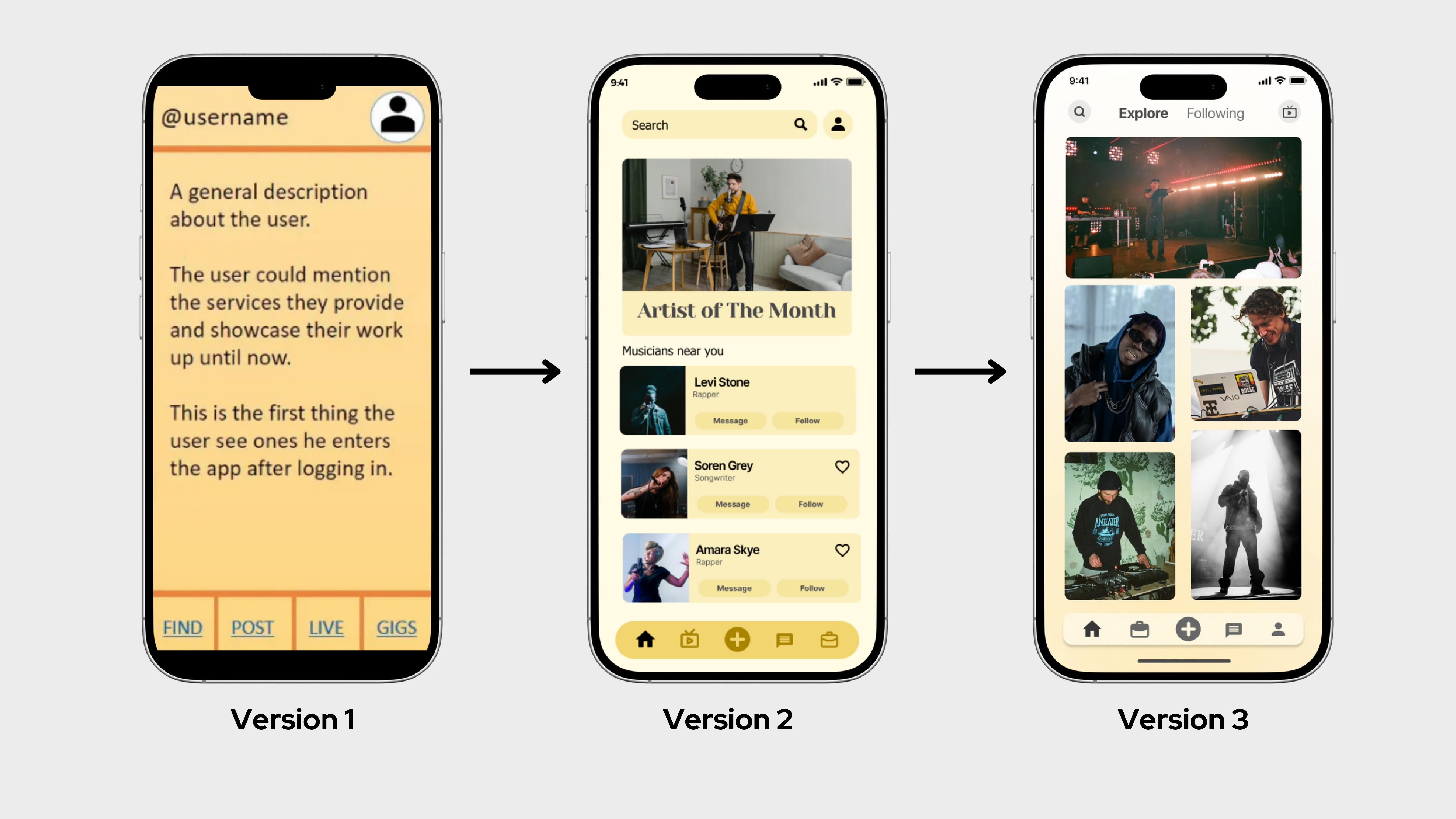 Version 2: Sections like "Artist of the Month" and "Musicians near you" were added to improve content clarity and usability, alongside the introduction of "Follow" and "Message" buttons to encourage social interactions.